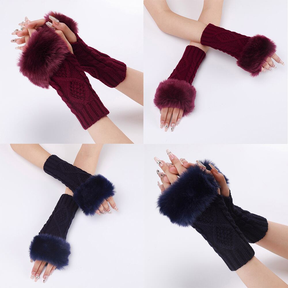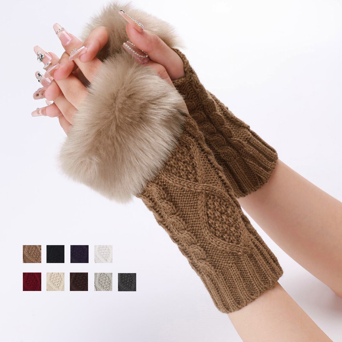 暖かな雰囲気を醸し出すケーブル編みのファー付きアームウォーマー。