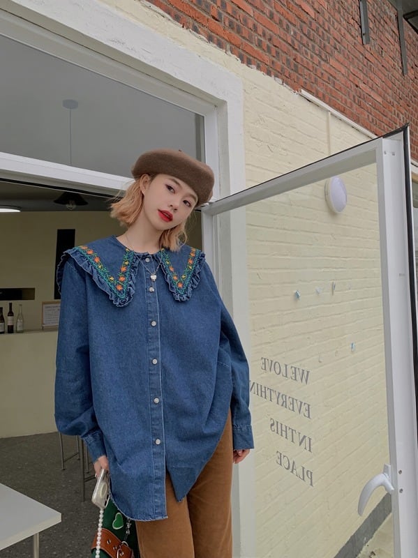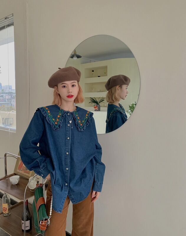 女性らしさを引き立ててくれるフリルと刺繍のデザインが、シンプルながらも個性的なアイテム。デニム素材なので、カジュアルなスタイルにもぴったり。着心地も抜群で、身体のラインを綺麗に見せてくれるので、女性らしさを引き立てる。